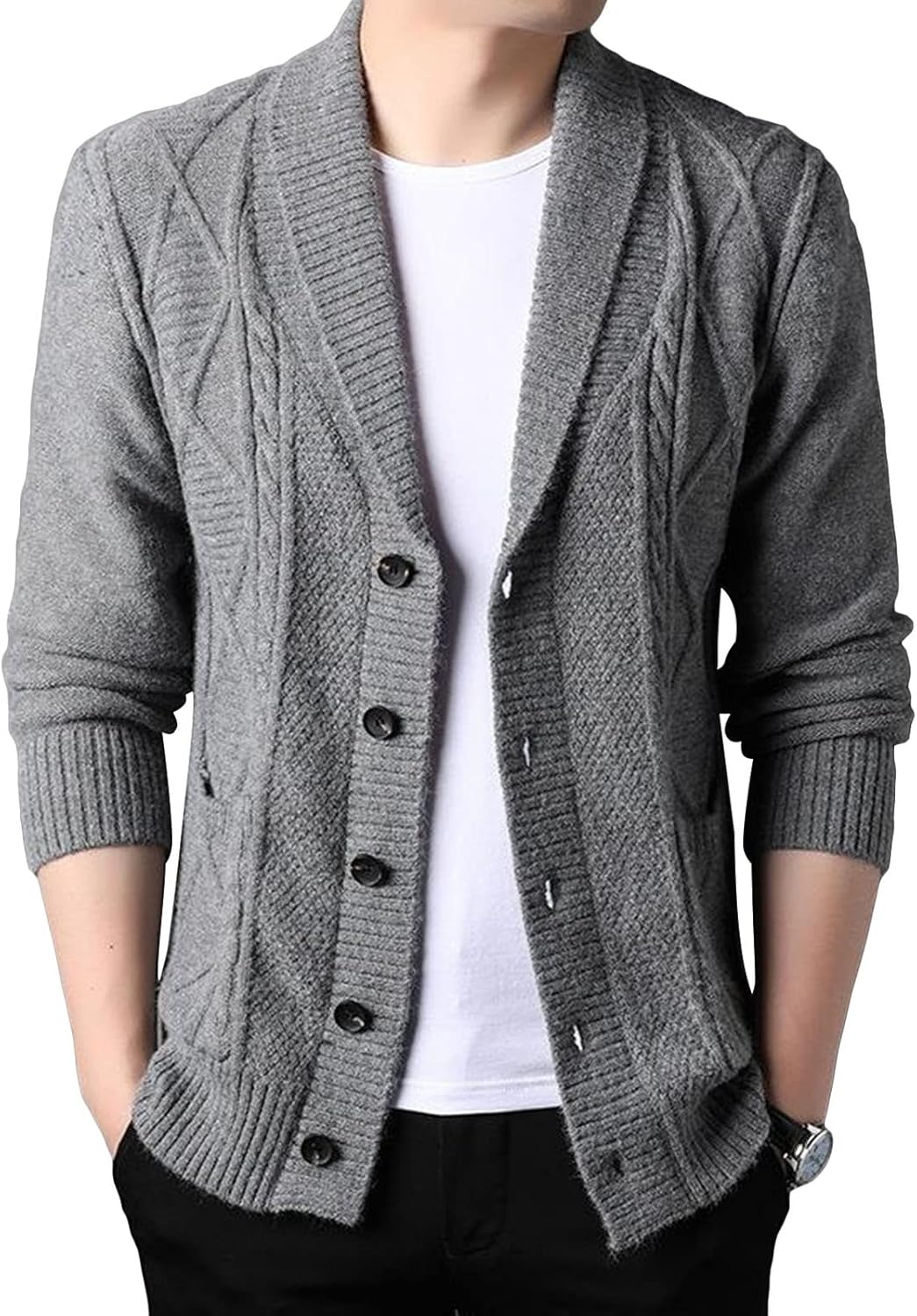 • Design: Mens Cable Knit Sweater. Shawl Collar, Cardigan Sweater, Long Sleeve, Cable Knitted, Solid, Ribbed Cuffs, Button Closure, Twisted Patterns