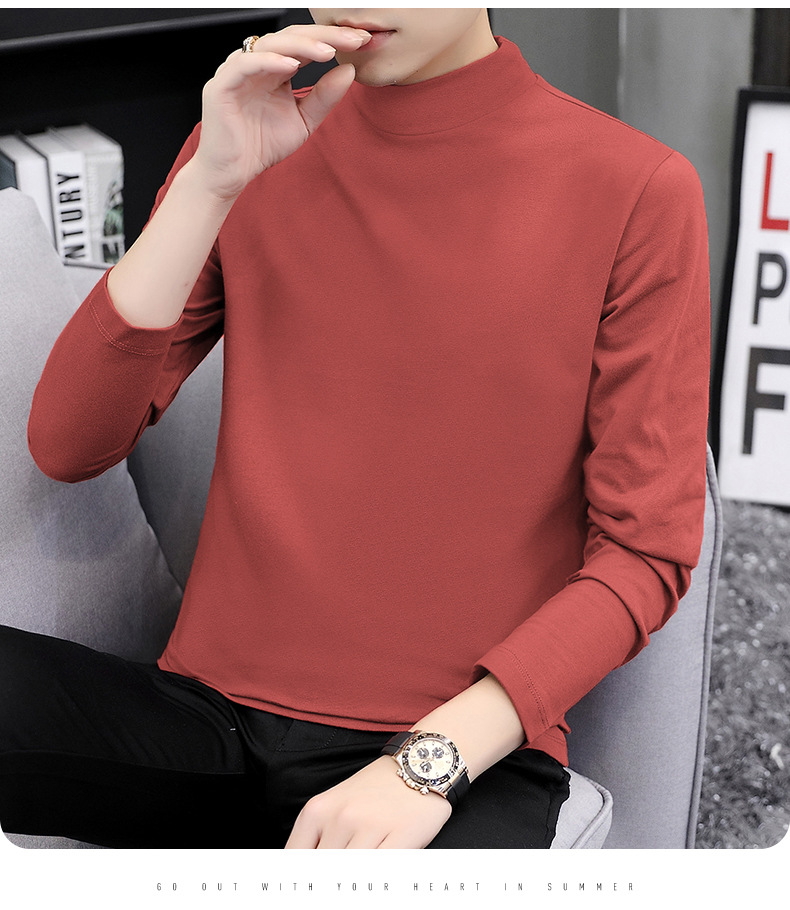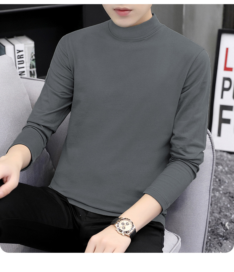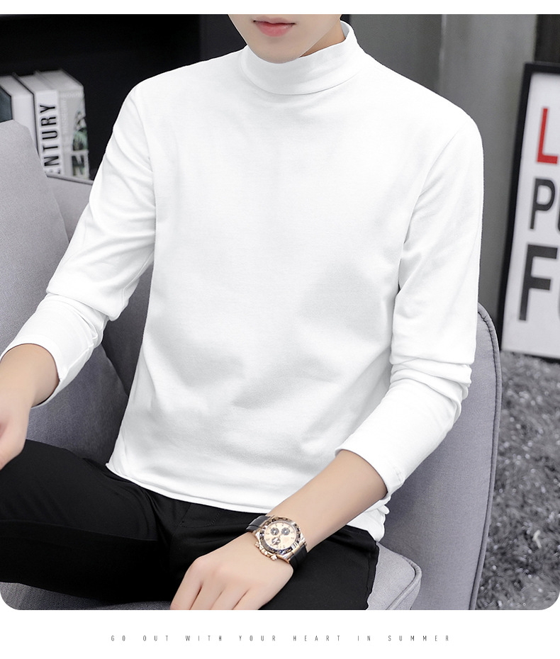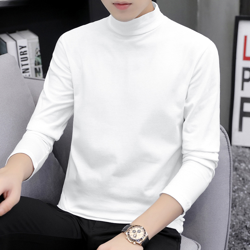 FINT RYIDES Men'S Long-Sleeve Cotton T-Shirt With Half-High Collar, Solid Color White Top, Mid-Collar Shirt, All-Cotton Tee