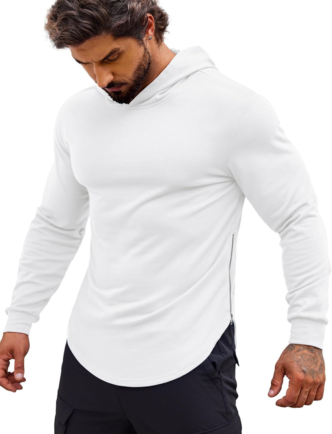 COOFANDY Mens workout sweatshirt with solid color, muscle fit, long sleeves, side zipper slits and rounded hem, no pockets better for workout wear.