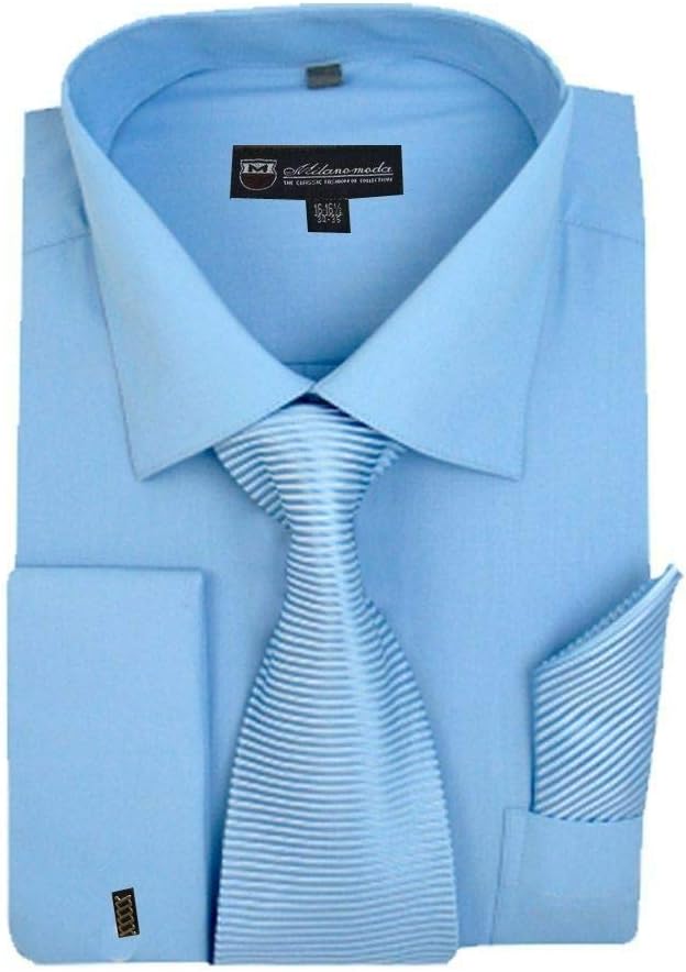 Milano Moda Solid Classic Dress Shirt with Matching Woven Tie and Hankie, French Cuffs and Spread Collar, in 7 Collors